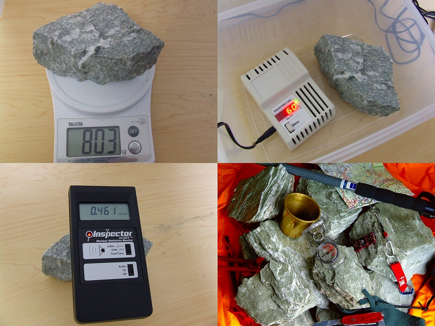 また、上記の鉱石を約3Lの密封された容器に入れてラドン計測機で計測したところ8,938Bqの数値が出ました。